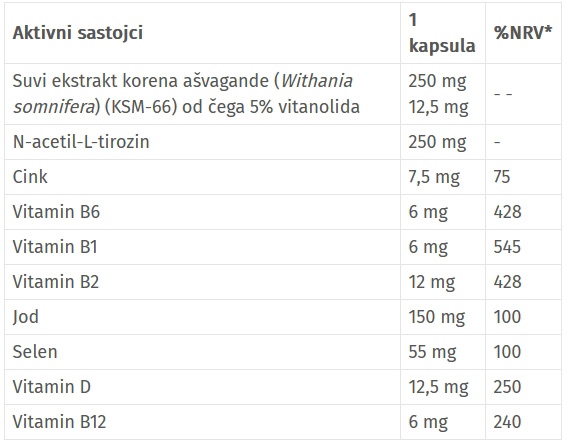 Sastojci: Suvi ekstrakt korena ašvagande (Vithanija somnifera) (KSM-66), N-acetil-L-tirozin, biljna kapsula (zgušnjivač: hidroksipropilmetilceluloza, prečišćena voda, boja: kalcijum-karbonat), sredstvo protiv zgrudnjavanja: mikrokristalna celuloza; cink-bisglicinat (ChelaZone®), selenom obogaćen kvasac (Saccharomyces cerevisiae) (Goldcell®), suvi ekstrakt alge fukus (Fucus vesiculosus) bogat jodom (150 mg joda/1 kapsuli), sredstva protiv zgrudnjavanja: magnezijumove soli masnih kiselina i silicijum dioksid; piridoksin-hidrohlorid (vitamin B6), tiamin-hidrohlorid (vitamin B1), riboflavin (vitamin B2), nikotinamid (niacin), cijanokobalamin (vitamin B12), holekalciferol (vitamin D).