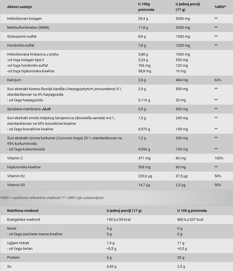 Namena proizvoda: Dodatak ishrani u prahu, za pripremu napitka sa kolagenom, MSM, glukozaminom, hondroitinom, kalcijumom, vitaminom C, biljnim ekstraktima i membranom jaja.