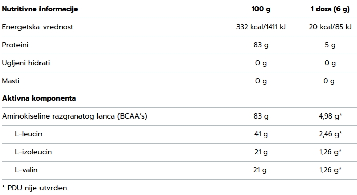- sadrži BCAA u odnosu 2:1:1 (L-leucin, L-izoleucin, L-valin)