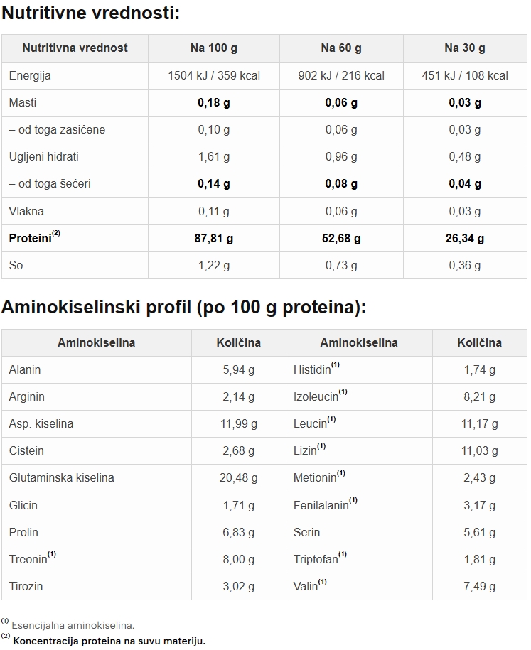 - Vrlo visok udeo proteina – preko 87 g na 100 g proizvoda.