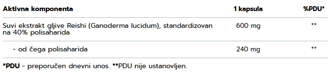 Sastojci: suvi ekstrakt gljive Reishi (Ganoderma lucidum), standardizovan na 40% polisaharida, kapsula (hidroksipropilmetilceluloza).