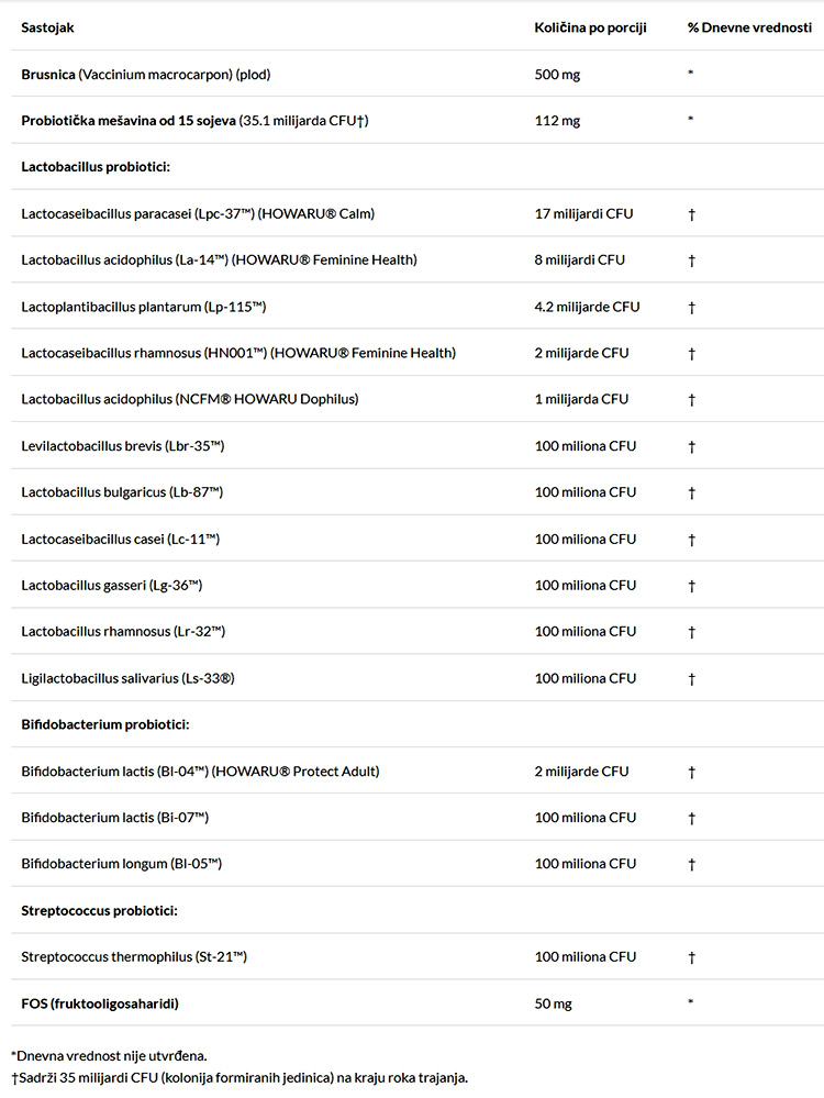 - Suplement sadrži brusnicu i FOS prebiotik u kombinaciji sa 35 milijardi CFU (živih bakterijskih ćelija u probiotičkoj formuli) po porciji iz 15 ciljanih, stabilnih probiotičkih sojeva, uključujući L. acidophilus NCFM